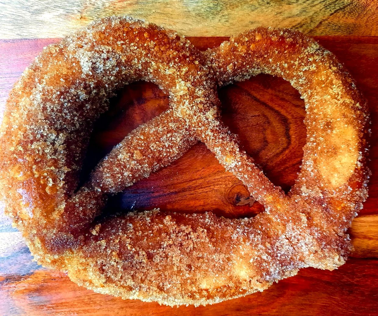 Cinnamon Sugar just may be the perfect pair. It never met a cookie or bun that it didn't improve! This time it's a pretzel. Our Cinnamon Sugar Pretzel is not just "fried dough" that is shaped like a pretzel. It is a real soft pretzel that is baked in the oven. When it comes out, we brush both sides with vegan butter and then press on our Cinnamon Sugar mixture by hand. Grandma would be proud!