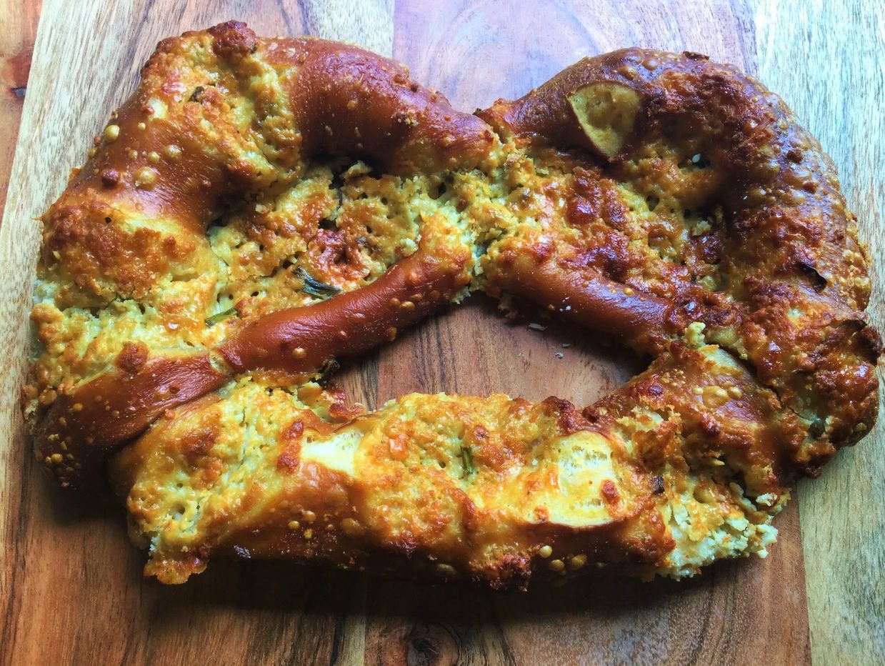 A variation on the Kasebretzel made with blue cheese, a bit of cream cheese and wild chives. This one is almost like a cross between a pretzel and savory cheese pastry. The chives grow on a sloping mountain terrace behind our bakery during the summer. Wildly delicious!